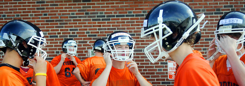 Gardiner Area High School football players put on their helmets Monday before practicing at the school. High School teams across the state to their fields for the first day of practice.