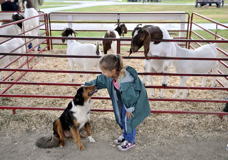 Samantha Gabor, 5, of Sebastian, Fla., gets side tracked from feeding the goats by the cuteness of a 2-year-old Shetland sheepdog named Shaylee at the Skowhegan State Fair on Wednesday. The fair runs through Saturday.