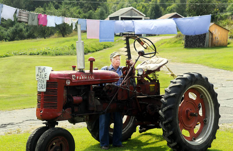 BROKEN IN: John Wing, 81, fires up a Farmall tractor Monday that he recently put up for sale on the front yard of his Manchester farm. Wing purchased the 1949 model from a neighboring farmer and utilized the implement to mow hay for 35 years. “I have two more in the barn,” he said was the reason he elected to part with the tractor for $1,500.00 or for the best reasonable offer.