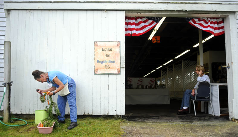 DECORATION: Jean Ward, left, washes carrots and beets while Flo Bolduc greets visitors setting up the exhibit hall Wednesday at the Litchfield Fair. The volunteers were prepping agricultural display items for judging at the Fair, which commences Friday and runs through Sunday.