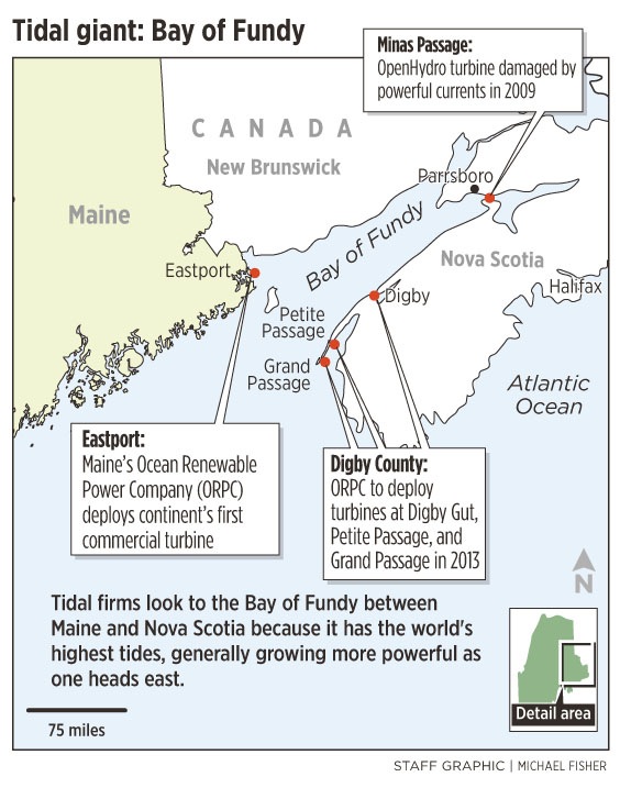 The Eastport area has Maine’s highest tides — 20 feet — because it is perched at the mouth of the vast Bay of Fundy. The Bay of Fundy has the world’s highest tides — more than 50 feet near the head of the bay in Nova Scotia — and Ocean Renewable and its U.S. and European rivals are competing to harness its energy.