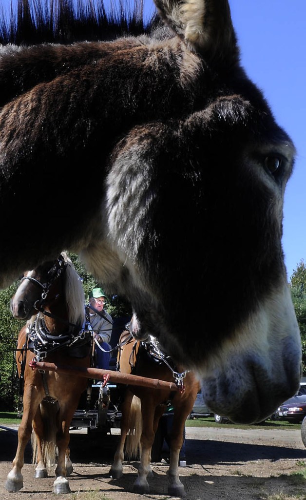 Leonard Kelley waits for riders to climb on a wagon Sunday he pulled with a team of draft ponies at Rawson Barter’s farm in Pittston. Barter invited about 100 friends and colleagues to attend his annual party for members of Local S6 who either work at or retired from Bath Iron Works. A 30-year-old donkey greets visitors at Barter’s home on Donkey Lane.