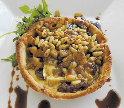 My appetizer was a delicious roasted pear and cambazola cheese tart: caramelized onions and pine nuts, a little arugula and served in great crust. Whoa! So good.