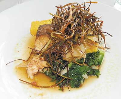 The large portions of halibut — crispy outside and moist inside — were paired with pieces of lobster in a sauce, deep-fried and salted leeks and accompanied by an escarole and crispy corn polenta. The halibut was topped with porcini dust. It was like opening a present stuffed with surprises every bite. First, a forkful of halibut, then a bit of escarole or leaks, add some lobster or polenta — wow! It was a smorgasbord in the mouth.