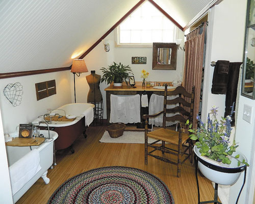 In Joan’s creative displays, expect the unexpected … artfully arranged rake heads, old doors and shutters for displays and Maine license plates decorated our bedroom. The bathroom of our suite was huge and came with two claw-foot tubs, each complete with a stand for wine glass and book!