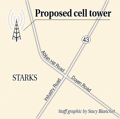 Cindy and Harry Brown, who own 80 acres across the road from the proposed tower site, have led opposition to its construction and were joined by about a half-dozen protestors who stood outside the Starks Community Center Wednesday evening. The Brown’s home is about 700 feet from the where the tower would stand.