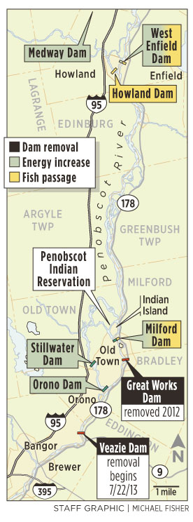 In fact, discussion of the three dams on the Mousam River is occurring as one of the largest dam removal projects in North America continues on the Penobscot River. On Monday, the Veazie Dam in Eddington will be breached, part of a larger, multi-dam project to return native sea-run fish to the Penobscot.