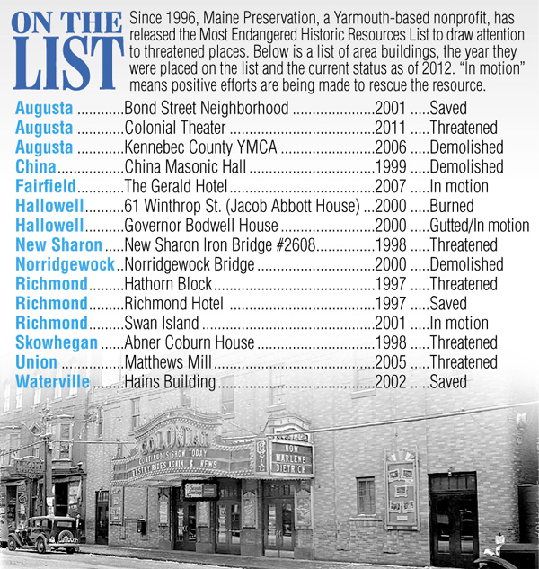The Gerald Hotel, under renovation in Fairfield, went on the list in 2007 and is “in motion,” but several Waterville-area buildings on the list are considered threatened, including the Hains buillding in Waterville, which went on the list last year, and the Abner Coburn House in Skowhegan and the New Sharon Iron Bridge, which have both been on the list since 1998.