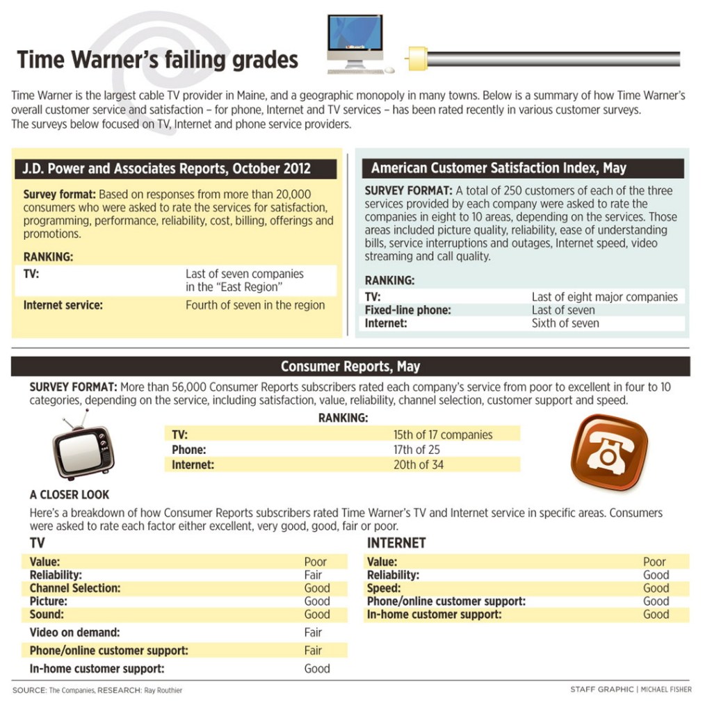 Plucknette-Farmen said that in the past year or so, Time Warner has made improvements to products and service. Specifically, she said the company has expanded the way people can reach it to include social media channels, and this year in Maine, it has started offering one-hour appointment windows instead of telling customers a service person would come between 8 a.m. and noon, for instance.