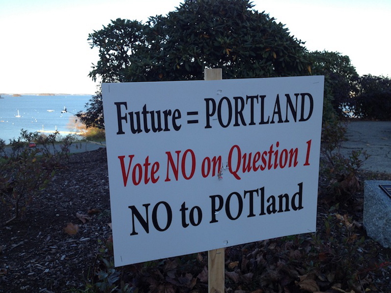 The signs say: “Future = PORTLAND. Vote NO on Question 1. NO to POTland.”