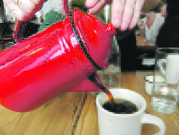 The table was littered with leftovers — a little bit of scramble here, a quarter of the buckle there — and, while I was so very full, everything was still tempting. Lin announced that she was going to the bathroom. “Do not eat anything while I’m gone,” she ordered. While she was gone, our server refilled our coffee cups from a stunning red pot. And I had a nibble or two of the buckle … and maybe a bit more of the French toast.