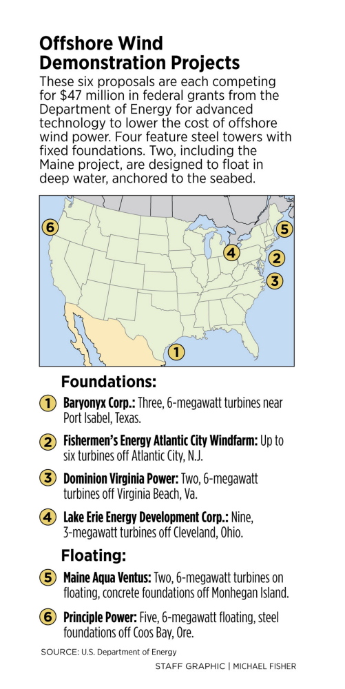 Principle is the top competitor to a university-led venture for up to $47 million in matching federal energy funds to demonstrate the technology for next-generation offshore wind turbines. Principle’s project, called WindFloat, would be located 15 miles off Coos Bay, Ore. UMaine’s design, called VolturnUS, would be in state waters near Monhegan Island.