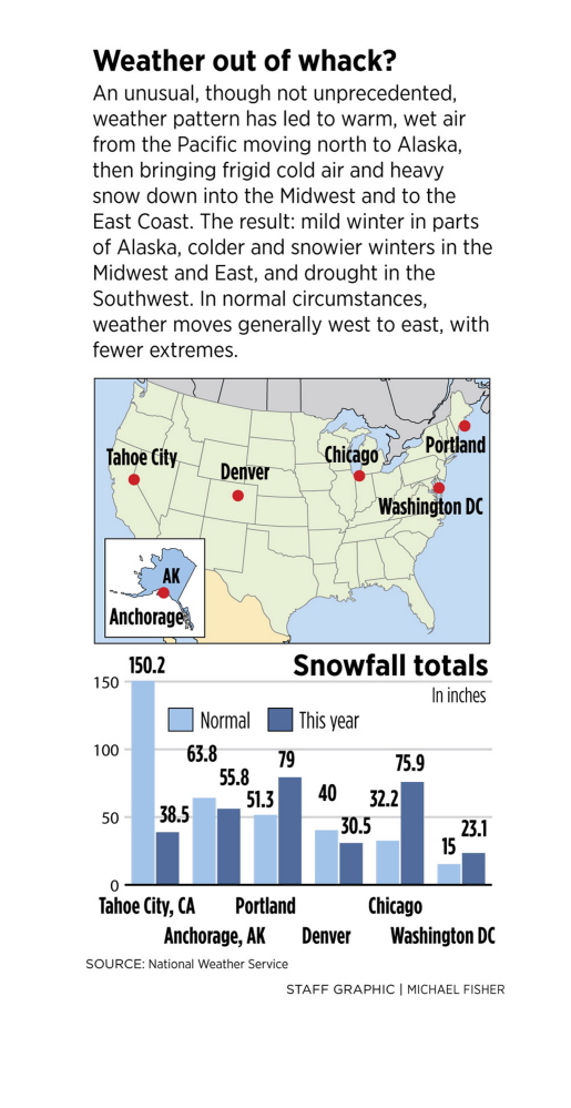 The same weather pattern that left just 6 inches of snow on the ground in Nome this week brought Wednesday’s storm system to Maine, part of an unusually cold and snowy winter stretching from the Midwest to the East Coast and down into the Mid-Atlantic.