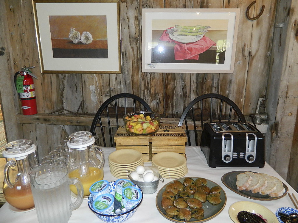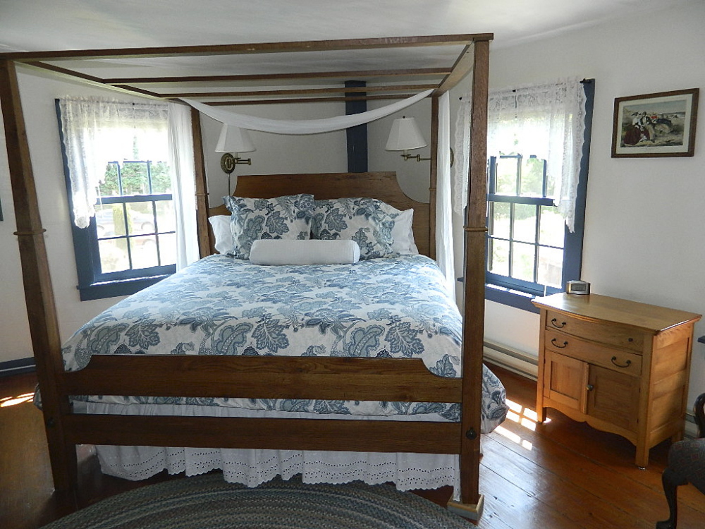 More lodging choices include a large single cottage and the two adjoining cottages where we stayed duing our visit. The cottages are beautifully decorated with antique accents. The large main room of our cottage held an antique corner cupboard, dining table and chairs to seat four, and a nice trunk used as a coffee table. The charming old lamp bases and wrought iron chandelier gave the cottage a distinct 1800s charm. Lots of windows keep the space light and cheery with the pastel yellow walls lending a summery feel.