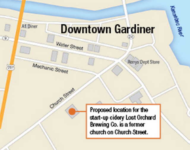 The start-up cidery, Lost Orchard Brewing Co., wants to use the former congregational church on Church Street to make the cider and eventually offer tastings to the public in the former sanctuary hall. The building, which was built in 1843, is bordered by houses on its two sides and back. Another church, First Baptist Church of Gardiner, is on the other side of the street a little up the hill.
