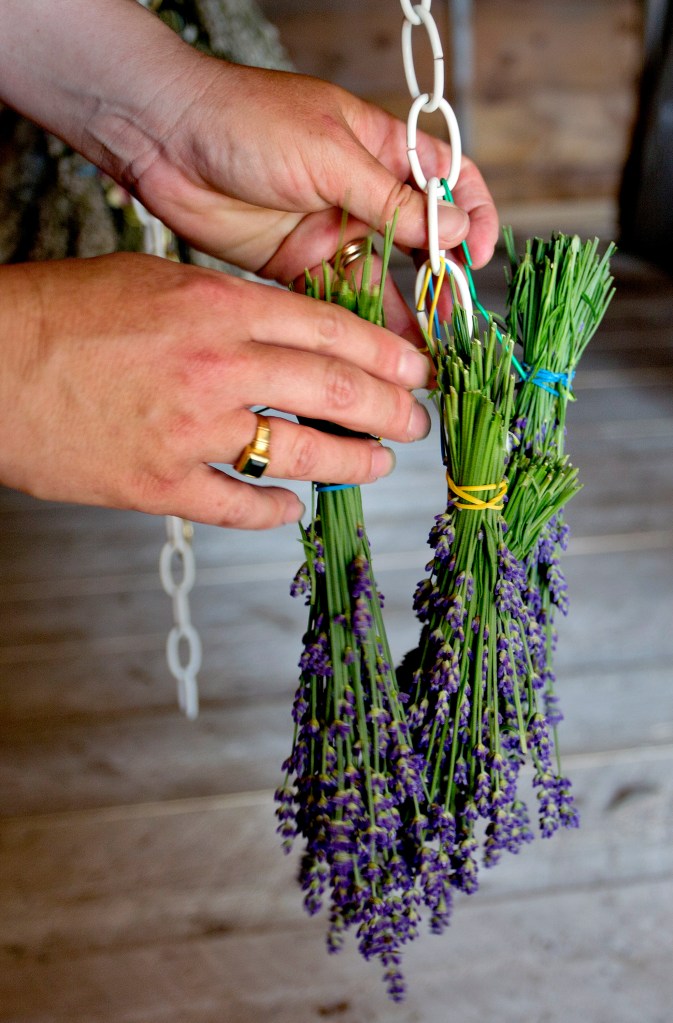 Each lavender bunch is tied with an elastic band and toted off to the barn for hanging later in the evening. It varies, but about eight to 10 bunches can be harvested from each plant. By the time Costigan is finished cutting for the day and is ready to start hanging the lavender to dry, there may be 1,000 bunches waiting for her in the barn. She hangs them from chains, from the bottom up, to maintain the best airflow. Good airflow and darkness are critical for drying lavender.