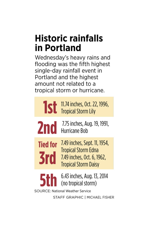 Wednesday’s rainfall was the highest 24-hour total in city history that wasn’t related to a designated tropical storm. Portland got 2.57 inches of rain from 9 to 10 p.m. alone, and another 1.64 inches in the following hour, said John Jensenius, a meteorologist with the National Weather Service in Gray.