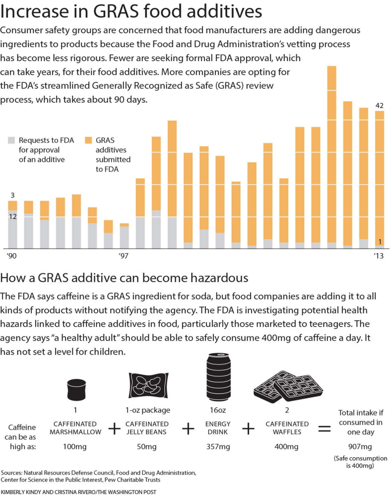 This is what happened with caffeine. In 1959, the FDA approved it as GRAS, allowing soft drink manufacturers to add it to their products. But now food manufacturers are loading caffeine into energy drinks, maple syrup, jelly beans and marshmallows.