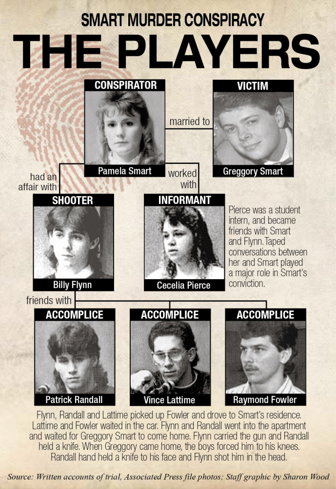 Pamela Smart wasn’t at the scene of the 1990 murder, but she was held responsible for most of it. Flynn testified that she recruited him and his friends to kill her husband, saying she didn’t want to lose possessions in a divorce. Flynn, who was 15 when the relationship started, said she threatened to end their relationship if he didn’t kill her husband.
