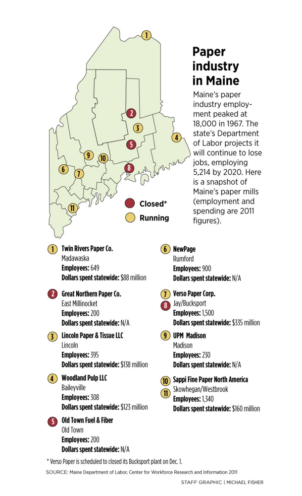On Dec. 1, Verso Paper’s Bucksport mill will join them, and more than 500 workers will lose their jobs. When that happens, only eight traditional pulp and paper mills will remain.