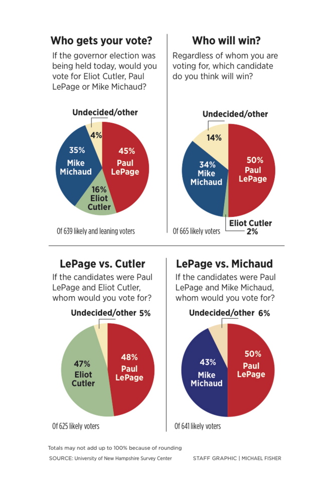 LePage leads Michaud 45 percent to 35 percent, with independent Eliot Cutler at 16 percent and 4 percent undecided, according to the poll of 639 likely voters conducted by the University of New Hampshire Survey Center. The landline and cellphone poll has a 3.8 percent margin of error and was conducted from Oct. 15 to 21, a period that coincided with three televised debates, leaving questions about whether the forums affected the results.