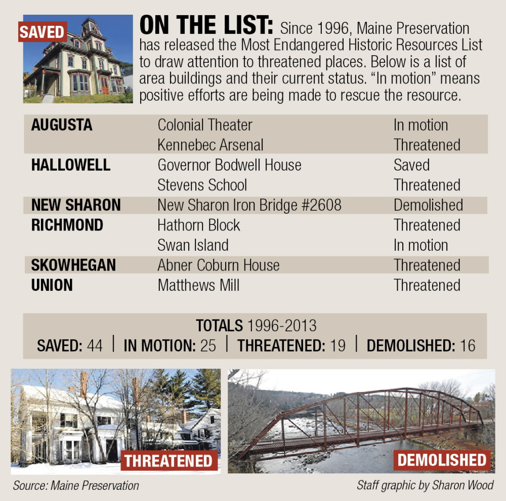 Also on the 2014 “endangered” list are Sewall Mansion in Bath, the Anson Town Office, the Abijah Buck House in Buckfield, the Lincoln Mill clock tower in Biddeford, the Biddeford City Hall clock tower, the Skowhegan Drive-In Theatre and the Belfast Opera House.