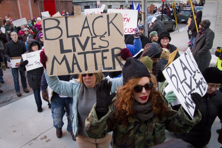 The marchers Sunday had a permit from the city, unlike the 250 people, organized by Portland’s Racial Justice Congress, who gathered Friday night along Congress Street before staging a “die-in” by lying down at the intersection of High and Spring streets.