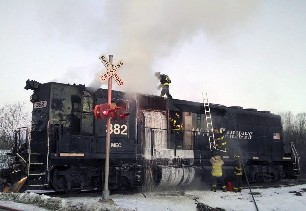 The Pan Am Railways train, which also had two other engines pulling 80 cars, was headed south when the crew noticed the train was losing power, Monmouth Fire Chief Dan Roy said. After discovering smoke coming out of one the engines, the crew stopped the train and backed it up to the railroad crossing on Berry Road in Monmouth, Roy said.