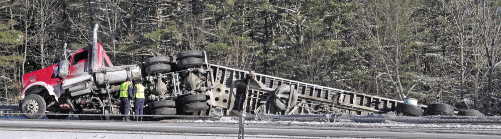 Removing the truck — which fetched up on the guardrail — and the overturned trailer proved a challenge, said Ted Talbot, spokesman for the Maine Department of Transportation. The process ultimately required officials to close both northbound lanes for a little over an hour. Crews initially did not anticipate having to close the road.