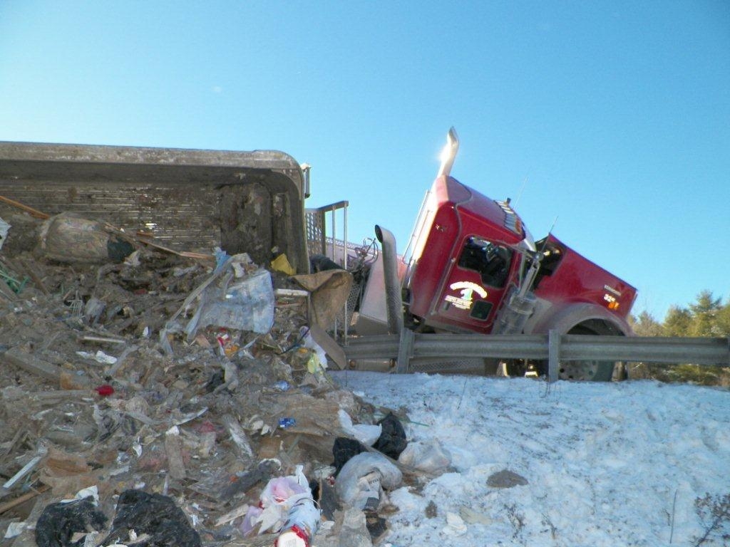 On Wednesday, the truck was removed from the road and crews cleaned up a large load of garbage that spilled over the embankment on a section of highway between the Western Avenue and Civic Center Drive exits. The road was opened to both lanes of traffic by 5:45 p.m., according to Maine Department of Public Safety spokesman Stephen McCausland.