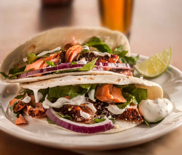 Divide spinach and salmon among the tortillas (about an ounce of salmon per taco). Top with the lime dill sauce, red onions, cotija cheese and fresh cilantro.