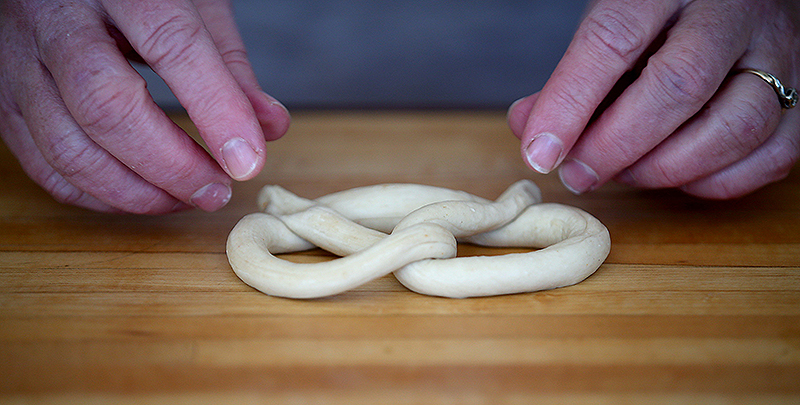 With each rope of dough, form a U shape and make a twist about 3 inches from the ends. Fold the twisted portion backwards along center of U to form a pretzel shape, then gently press ends onto the dough to seal. Transfer to the baking sheet. After all are shaped, cover each pan with a clean towel and let rest for 20 minutes.