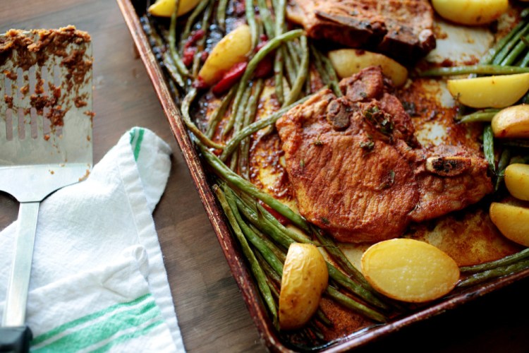 Toss green beans, potatoes and red pepper with the remaining 3 tablespoons olive oil on a large rimmed baking sheet. Spread in an even layer. Nestle pork chops among the vegetables.