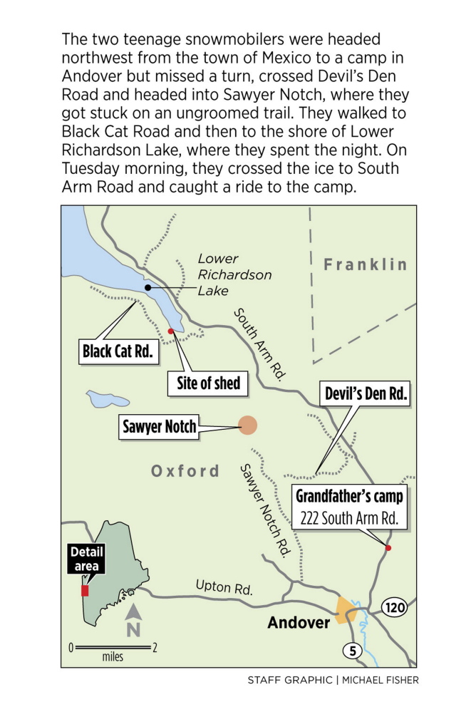 Tyler attends school in Rhode Island, but he grew up in Rumford and knows the area. In an interview at his grandfather’s camp Tuesday afternoon, Tyler said he trusted the survival training he had received from his family and knew he and his friend would be fine if they kept their wits about them.
