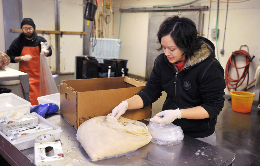 The next stop is Upstream Trucking on the Portland waterfront, where Stadler buys seafood from wholesaler George Parr. He watches as she sorts through a bag of dayboat scallops out of Chatham, Massachusetts, picking out 5 pounds’ worth of smaller ones for her small plates. Parr has set aside 10 pounds of coveted Maine shrimp for Stadler, who will use it at Tao Yuan for Shanghai shrimp in shell, a dish her mother taught her. Her shopping list also includes a few pounds of tuna, 100 Johns River oysters and 50 clams.