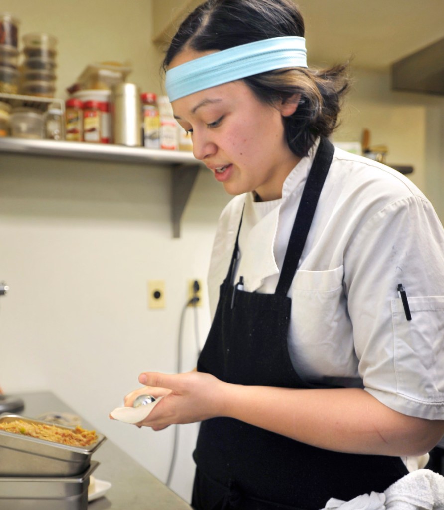 The kitchen is already busy prepping lunch when Stadler arrives. Stadler works on the shrimp, thinly slices a big hunk of ginger and spends time folding dumplings filled with miso, parsnip, chicken, bamboo and chili.