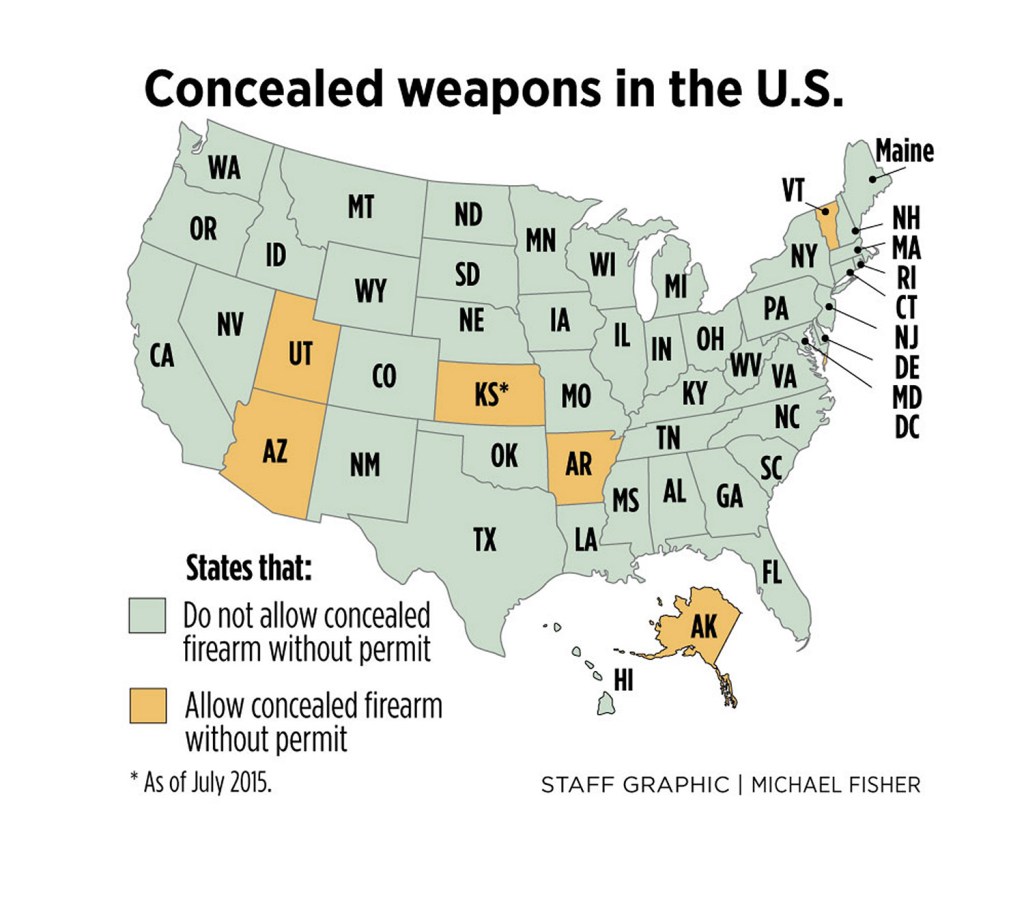 Currently, Alaska, Arizona, Arkansas, Kansas, Utah and Vermont have no restrictions on carrying concealed handguns.
