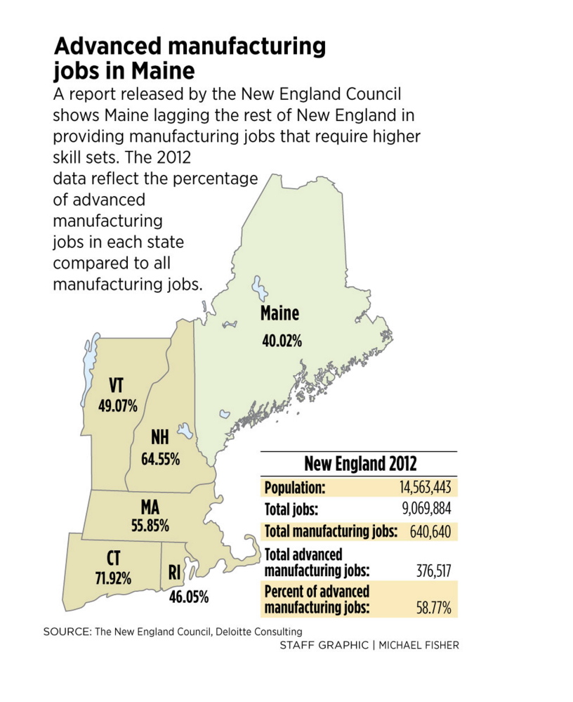 The report, prepared by the New England Council and Deloitte Consulting, says that 40 percent of the manufacturing jobs in Maine could be described as “advanced” in 2012. Every other state in the region had a higher percentage of its manufacturing base consisting of advanced manufacturing jobs, ranging from 48 percent in Rhode Island to nearly 72 percent in Connecticut. The New England average is 58.7 percent.