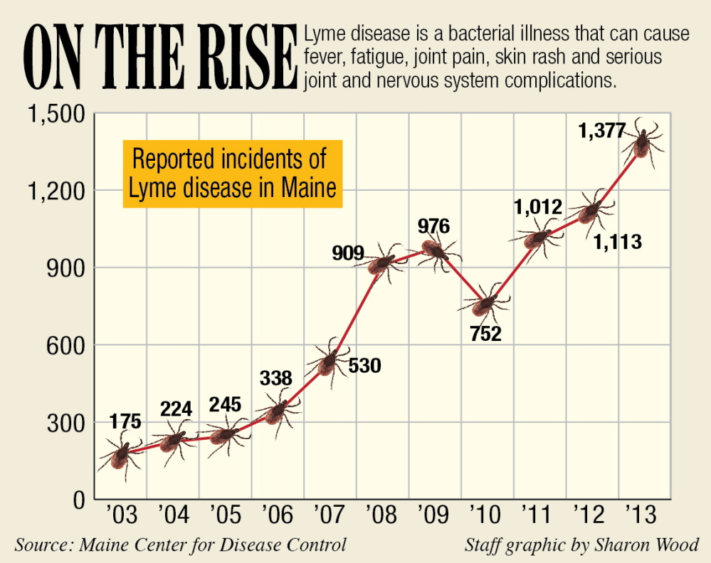 There were more than 1,300 cases of Lyme disease reported in Maine in 2013, nearly eight times more than the 175 reported a decade before, according to the Maine CDC. Children between the ages of 5 and 14 are more likely than any other age group to contract Lyme disease and about twice as likely compared to adults ages 25 to 44.