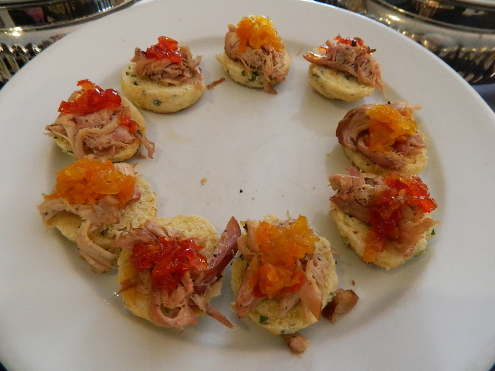 Cream cheese biscuits with confit of chicken salad, hot pepper jelly or carrot jam