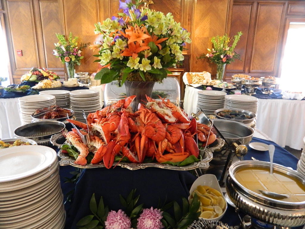 Many guests have a hard time getting by the very first table, featuring a tall platter of lobster. I saw an awful lot of diners going by us in the dining room with plates full of lobster and little else. I started out with just a half lobster but enjoyed it a lot. I’d barely started eating when Linda said, “You’ve got lobster on you.” Well, that’s how you eat lobster, isn’t it?