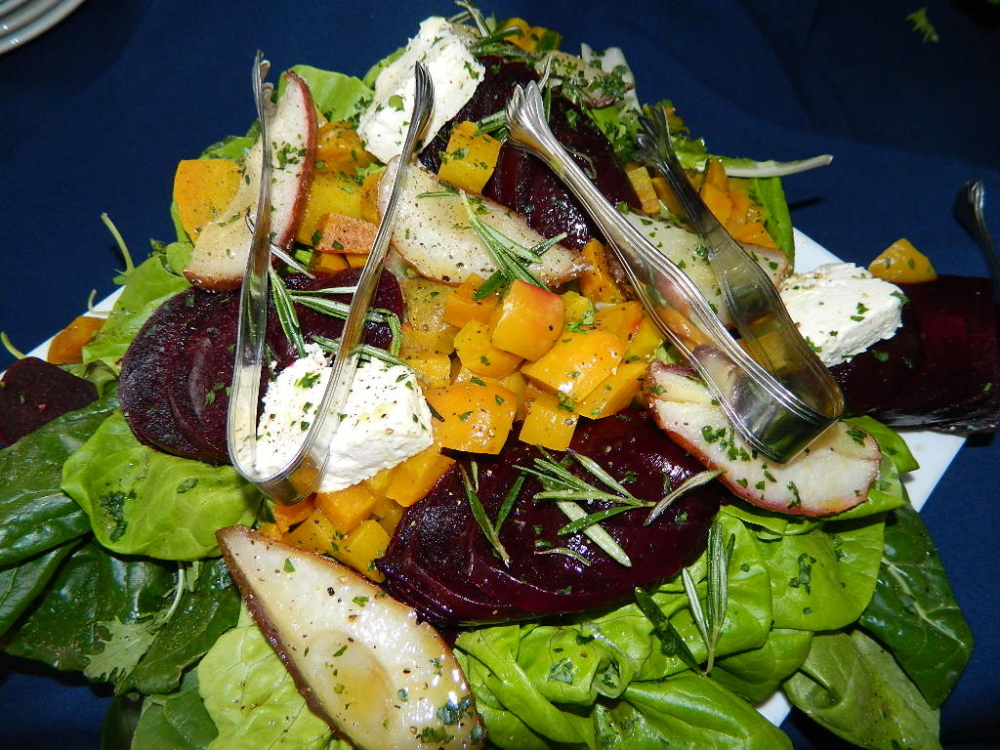 A beet salad with local farmers cheese and roasted red Anjou pears