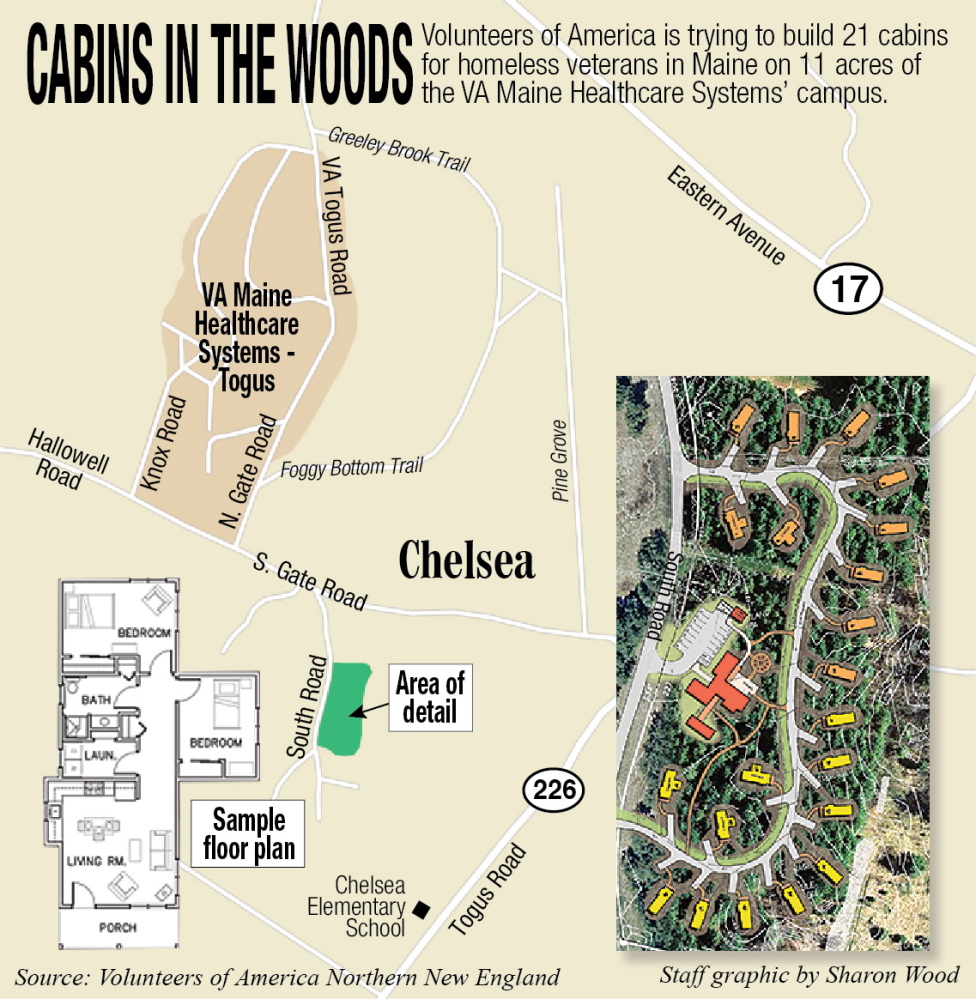 The cabins would be built in a wooded area off South Gate Road, which leads to Route 226 and the nearby Chelsea Elementary School. Volunteers of America opened a similar complex of cabins near the federal veterans’ hospital in Lake City, Fla., in 2008.