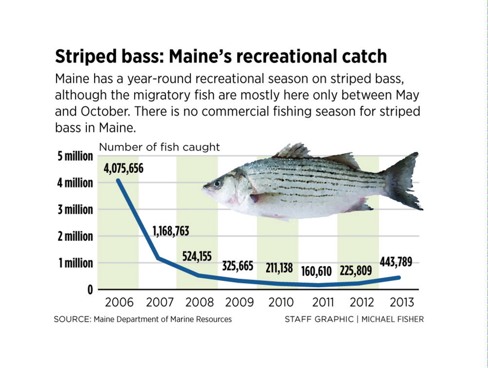 Other coastal states in the Northeast also have seen a dramatic decline in striped bass, though biologists are at a loss to explain exactly why. Maine is at the northern end of the range for stripers, which spawn in coastal estuaries, primarily the Chesapeake Bay, and migrate up the coast in the spring and back south in the fall. Typically, they are found in Maine between May and October.