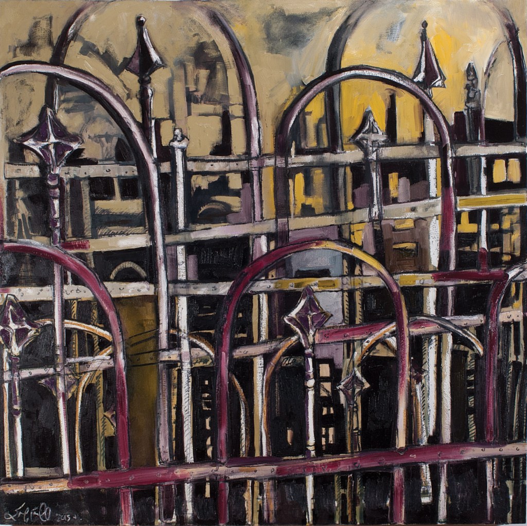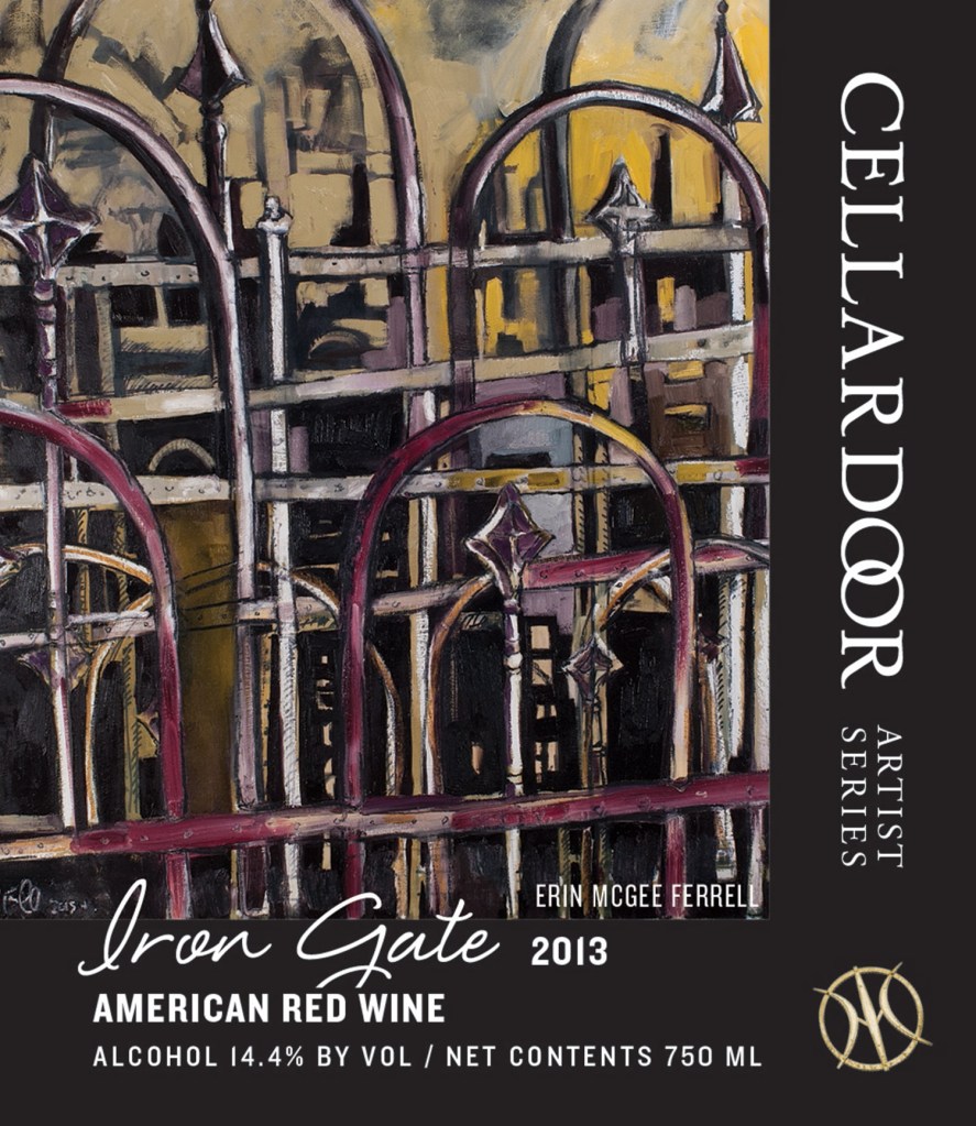 Ferrell began a series of large oil paintings with iron gates as a central motif, and submitted two to Cellardoor for consideration. The winery bought both, one for the label and the other for display.