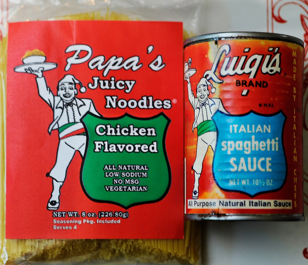 The sauce, sold as the Luigi’s brand, had a distinctive red label featuring a cartoonish-looking Italian man carrying a tray with a bowl of spaghetti and a glass of wine. (Like Gimbels, the company closed in the mid-1980s, unable to compete with the big jars of sauce on grocery store shelves, Nancy Polito said.) When it came time to make a label for Papa’s Juicy Noodles, the family decided to go retro and tinkered with the old label, replacing the pasta and wine on the tray with a bowl of noodles.
