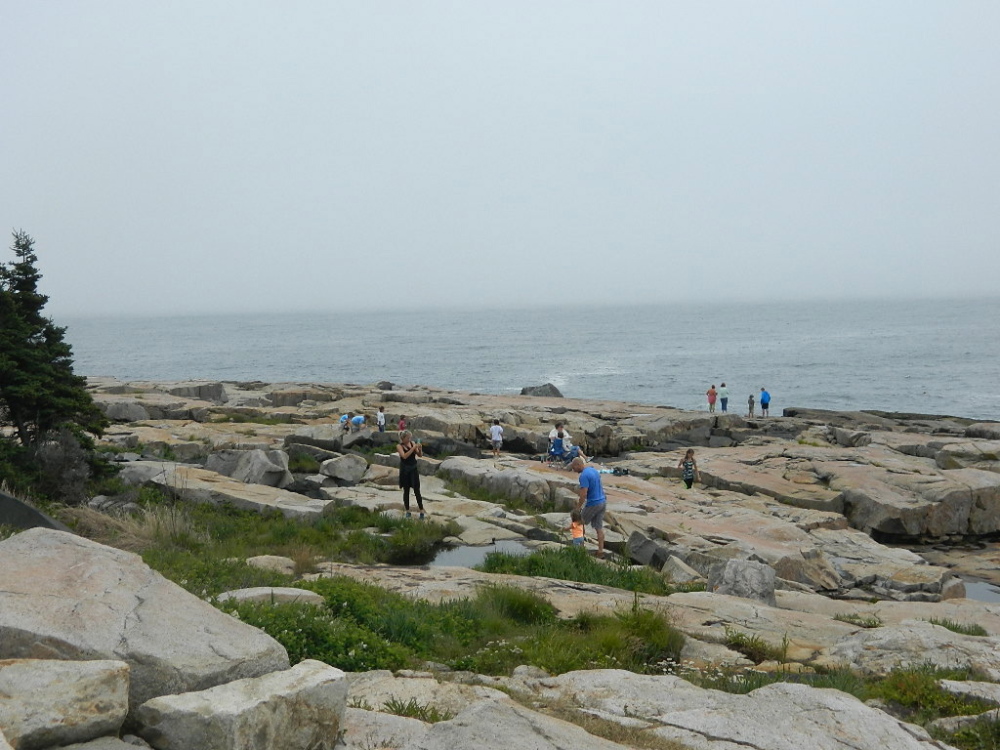 I probably have driven by the sign for Schoodic Peninsula dozens of times, but up until now have never explored it. We took the one-way loop drive that leads to Schoodic Point where we found many families enjoying a picnic out on the perfectly flat rocks. And what a picnic spot it is! It was noticeably cooler than the scorching hot day we’d left just up the road due to the fog that was hanging a bit off from the point.