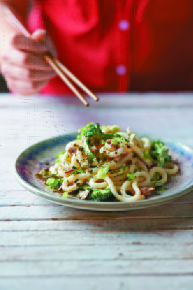 Add the bacon mixture and toss well with the reserved cooking water. The egg and Parmesan mixture will emulsify into a sauce, coating the udon strands as you keep tossing. Garnish with the scallion greens, toasted nori and plenty of black pepper. Serve immediately on warmed plates.