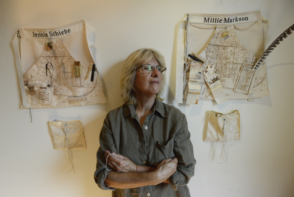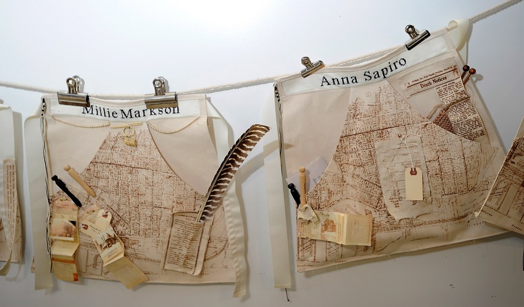 These were everyday Portland women, motivated to help out of a sense of compassion and moral obligation, she said. In addition to Sapiro, the group included Jennie Markson, Mildred Markson, Jennie Schiebe, Helen Rosenberg, Molly Press and Lenna Perry. Israelson pieces their stories together through census and tax records, marriage licenses, birth and death certificates, and interviews with relatives. She tells their stories by adorning their aprons with photos, maps and other items from the women’s histories.