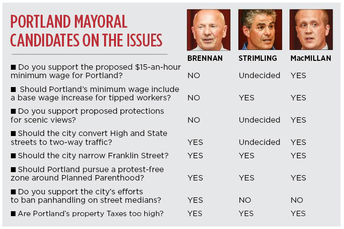 Brennan, who led a successful effort to establish a $10.10-an-hour minimum wage in Portland that will take effect in January, has openly opposed the $15 minimum, while Strimling has not yet publicly taken a position.